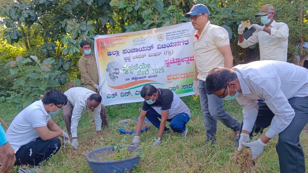 ವಿಜಯನಗರ ಜಿಲ್ಲಾ ಪಂಚಾಯತ್ ನಲ್ಲಿ ಸ್ವಚ್ಚತಾ ಹೀ ಸೇವಾ ಪಾಕ್ಷಿಕ್- 2025ರ “ಸ್ವಚ್ಚೂತ್ಸವ” (ಸೆಪ್ಟೆಂಬರ್ – 17 ರಿಂದ ಆಕ್ಟೋಬರ್– 02 ವರೆಗೆ) ಅಭಿಯಾನದ ಅಂಗವಾಗಿ ಸೆಪ್ಟಂಬರ್-25 ರಂದು ಸಾಮೂಹಿಕ ಶ್ರಮದಾನ (ಎಕ್ ದಿನ್,ಎಕ್ ಘಂಟಾ, ಎಕ್ ಸಾಥ್) ಕಾರ್ಯಕ್ರಮಕ್ಕೆ ಮುಖ್ಯ ಕಾರ್ಯನಿರ್ವಾಹಕ ಅಧಿಕಾರಿಗಳಾದ ಮಾನ್ಯ ಶ್ರೀ ನೊಂಗ್ಜಯ್ ಮೊಹಮದ್ ಅಲಿ ಅಕ್ರಮ್ ಶಾ ಇವರು ಸಸಿ ನೆಡುವ ಮೂಲಕ ಚಾಲನೆ ನೀಡಿ, ಅಭಿಯಾನದ ಕುರಿತು ಮಾತನಾಡಿದರು.