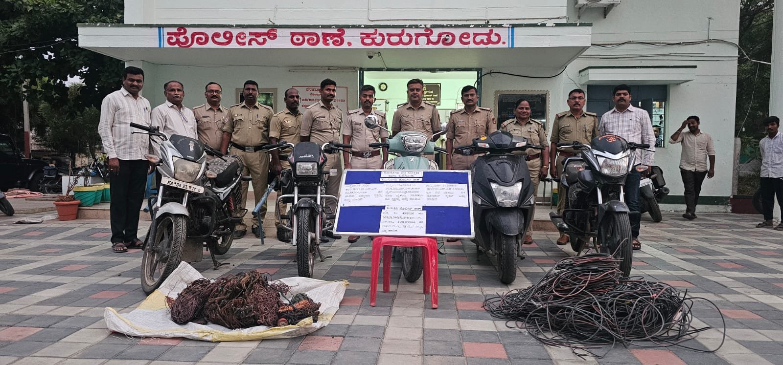 ಸುಮಾರು ₹1,50,000 ಮೌಲ್ಯದ ಕಾಪರ್ ವೈರ್ ಪತ್ತೆಯಾಗಿದ್ದು, ಮೂವರು ಆರೋಪಿತರಾದ ಮೌನೇಶ್ (ತಂದೆ ಗಂಗಾಧರ), ಮೌಲಾಲಿ (ತಂದೆ ಹೊನ್ನೂರಸ್ವಾಮಿ) ಮತ್ತು ಉಪ್ಪಾರ್ ರಾಜ (ತಂದೆ ಯಲ್ಲಪ್ಪ) ಬಂಧಿಸಲಾಗಿದೆ.
