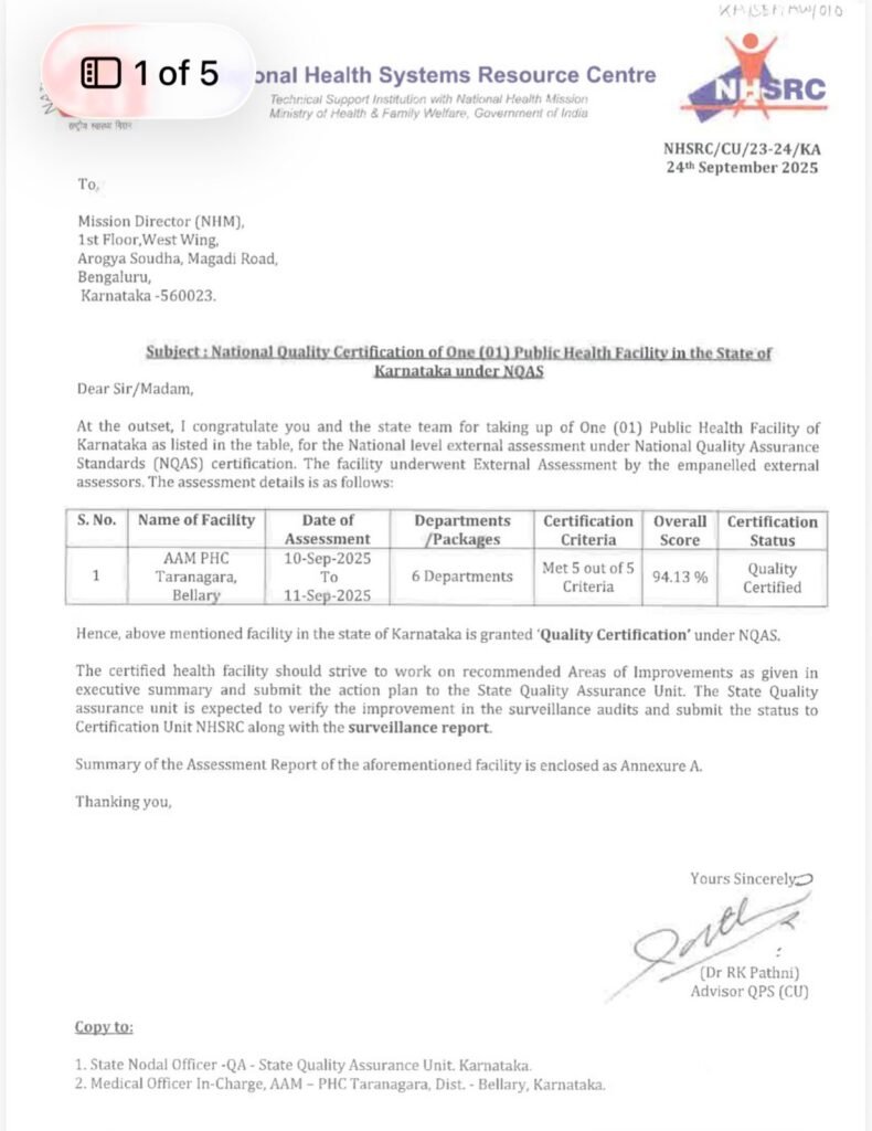 ಬಳ್ಳಾರಿ ಜಿಲ್ಲೆಯ ಬಂಡ್ರಿ ಹಾಗೂ ತಾರಾನಗರ ಪ್ರಾಥಮಿಕ ಆರೋಗ್ಯ ಕೇಂದ್ರಗಳು (PHC) ರಾಷ್ಟ್ರೀಯ ಆರೋಗ್ಯ ಮಿಷನ್ (NHM) ಅಡಿಯಲ್ಲಿ ಜಾರಿಯಲ್ಲಿರುವ ರಾಷ್ಟ್ರೀಯ ಗುಣಮಟ್ಟ ಭರವಸೆ ಮಾನದಂಡಗಳ (NQAS) ಪರಿಶೀಲನೆಯಲ್ಲಿ ಶ್ರೇಷ್ಠ ಸಾಧನೆ ಮಾಡಿ ರಾಷ್ಟ್ರೀಯ ಮಟ್ಟದ ಗುಣಮಟ್ಟ ಪ್ರಮಾಣಪತ್ರವನ್ನು ಪಡೆದುಕೊಂಡಿವೆ. ಇತ್ತೀಚಿಗೆ ನಡೆದ ಹೊರಗಿನ ಸಮಗ್ರ ಮೌಲ್ಯಮಾಪನದಲ್ಲಿ ಈ ಕೇಂದ್ರಗಳು ಒಟ್ಟಾರೆ 94.50% ಅಂಕಗಳನ್ನು ಗಳಿಸಿರುವುದು ಜಿಲ್ಲೆಯ ಆರೋಗ್ಯ ಕ್ಷೇತ್ರದಲ್ಲಿ ಮಹತ್ವದ ಸಾಧನೆಯಾಗಿ ಗುರುತಿಸಲಾಗಿದೆ.